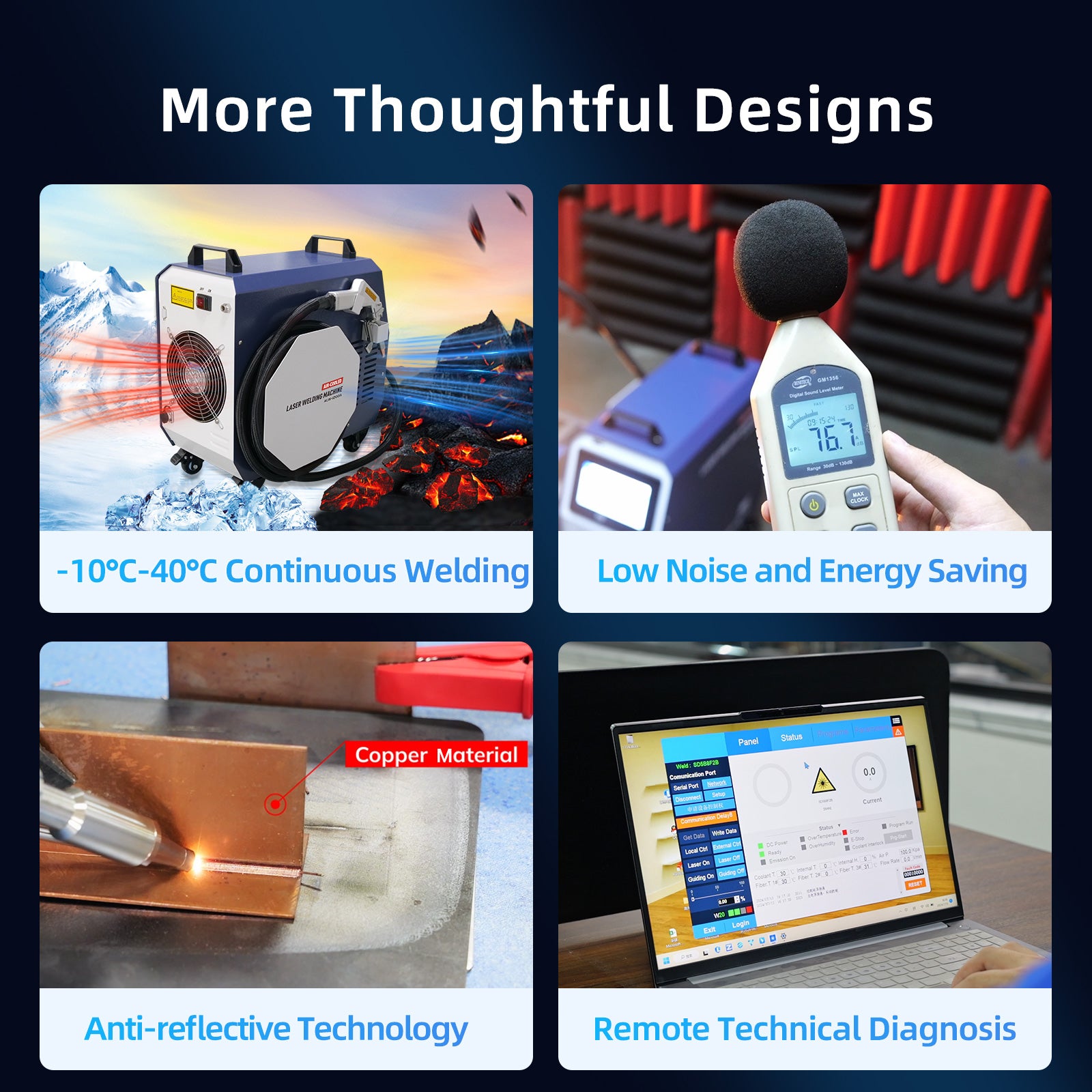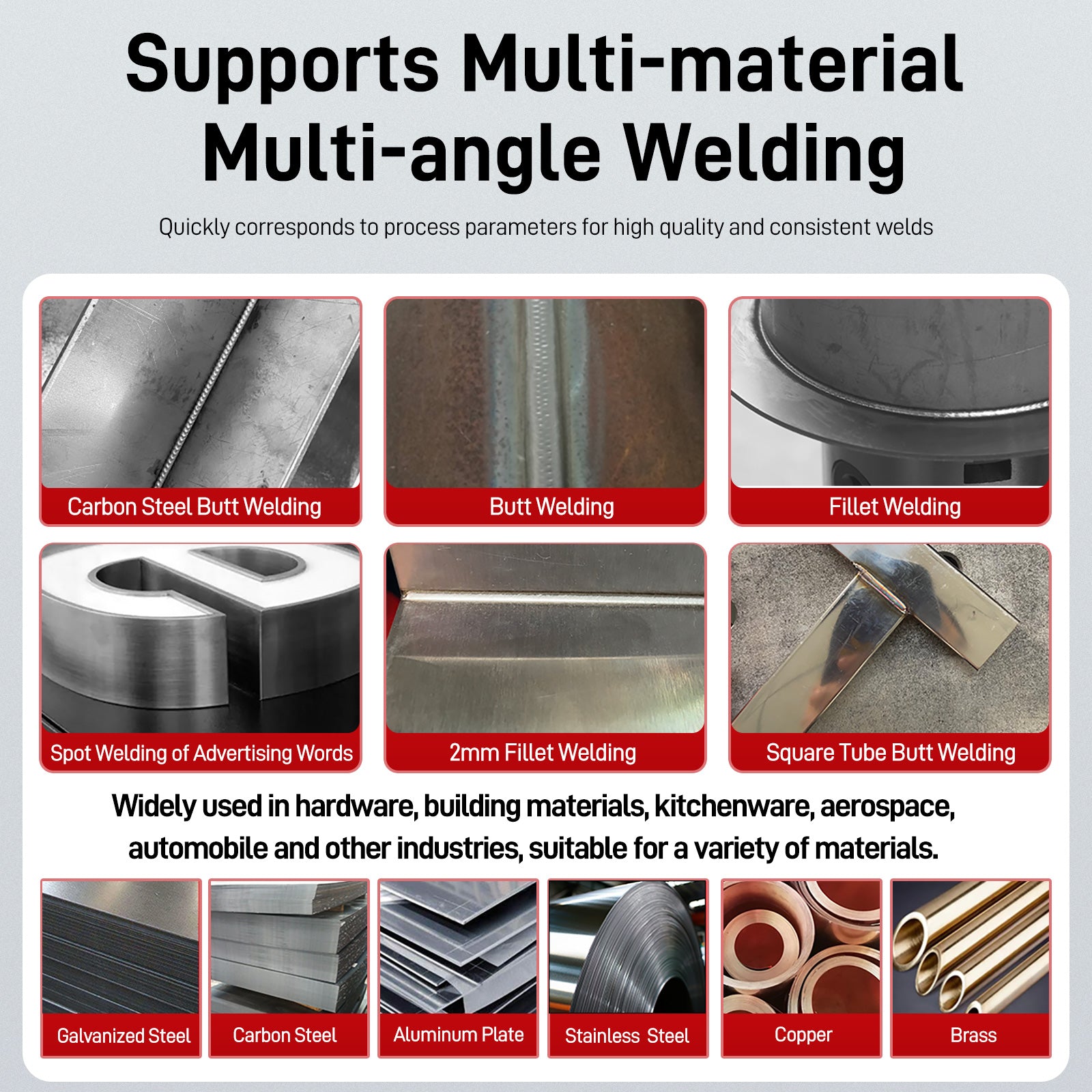 Versatile Applications: The welding speed is 4-10 times faster than traditional fiber laser welding machines. For different materials, the single-side melting depth is as follows: stainless steel: 4mm, carbon steel: 4mm, galvanized sheet: 4mm, aluminum: 4mm, brass: 4mm, purple copper: 4mm. The 2-in-1 air cooling portable welder can also be used in many fields, such as automotive, electronics, automated manufacturing, shipbuilding, oil and gas, etc.